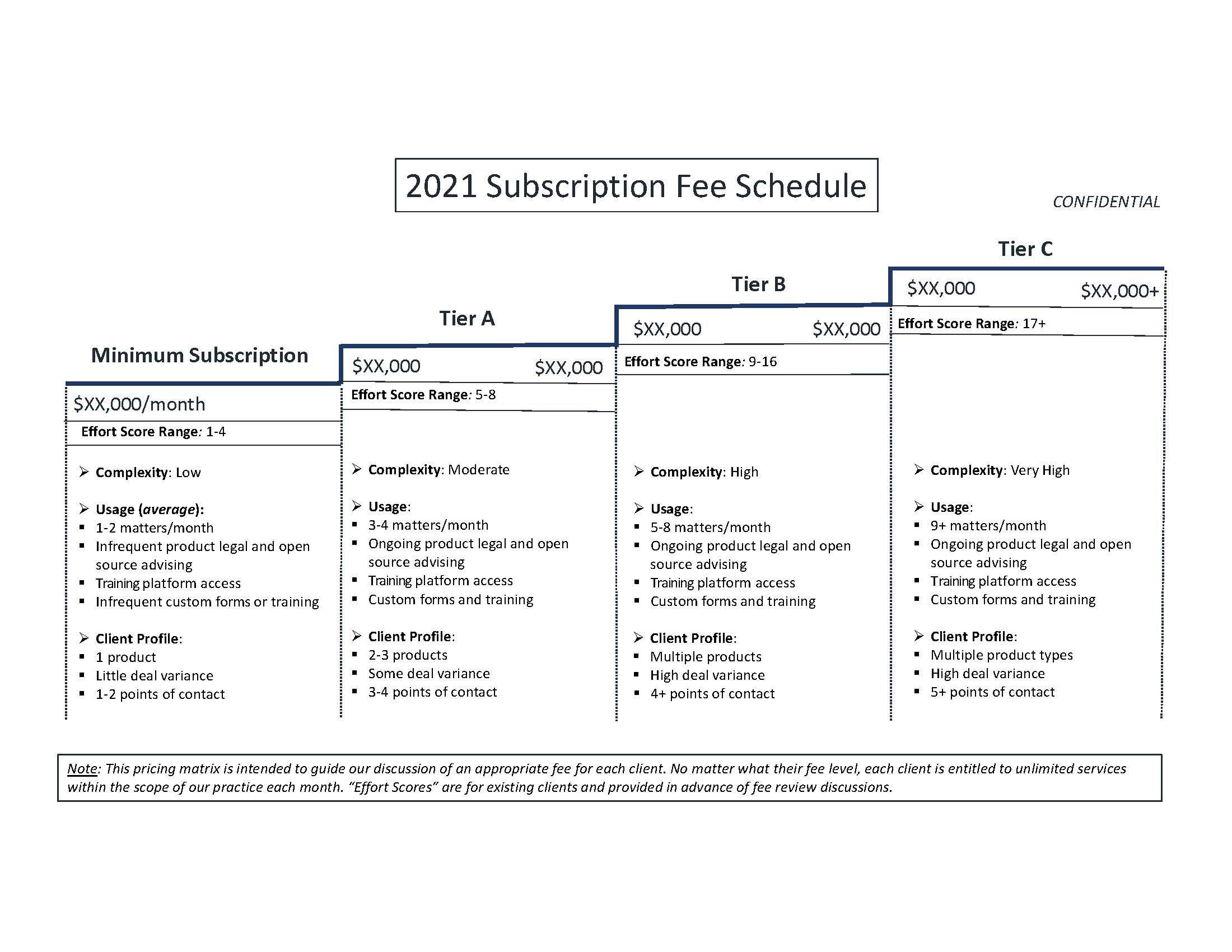 The firm must anchor the conversation. As a law firm, if you want to move your client off the billable hour, you need to do the work. You have to anchor your fee system in a methodology that ties back to some sort of hard metrics around the value you provide and that allows the client to feel pricing to them is fair when compared to others. You can see how we approached that in our pricing schedule and benchmark reports, but whatever your approach, build the golden bridge for the client.